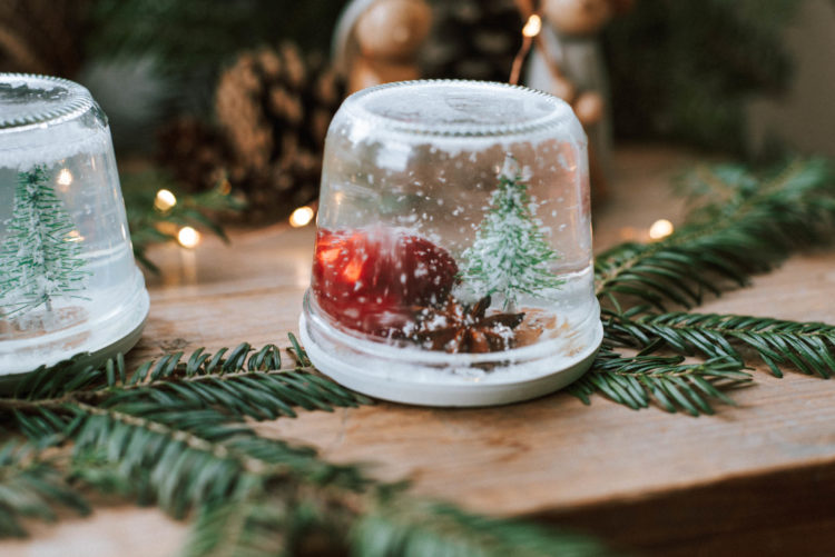 Geschenk-Tipp: Wenn ihr wollt, könnt ihr die Schneekugeln mit einem Stück Geschenkband oder Garn umwickeln und mit einem kleinen Zweig schmücken – schon habt ihr das perfekte kleine Geschenk.