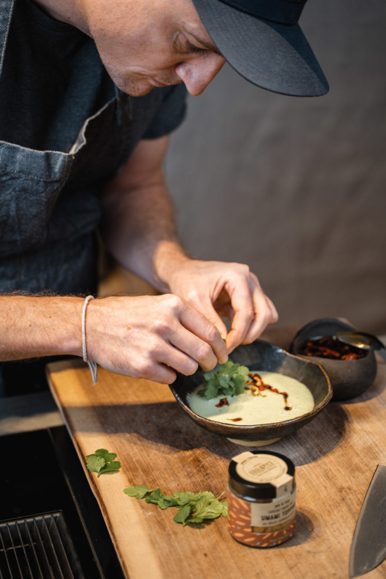 Sebastian: Ich denke, Essen hat immer viel mit Emotionen zu tun. Wie und was ich esse, wurde enorm durch meine Kindheit geprägt. Ich bin auf dem Land in Bayern aufgewachsen, mit Schweinsbraten, deftigen Eintöpfen und einfach viel Umami. Diese Art von Geschmack macht mich beim Essen einfach glücklich. Folglich habe ich die letzten Jahre versucht, diese Art zu kochen und zu essen, auch in einer reinen pflanzlichen Küche gut umsetzbar zu machen. Ich denke, es ist wirklich wichtig, zu zeigen, dass man durch eine vegane Ernährung, auf tierische Produkte, jedoch eben nicht auf diese Art des Geschmacks verzichten muss. Das versuche ich in meinen Kursen, bei unseren Dinnerevents oder bei meiner Online-Kochschule Vegan Masterclass den Menschen zu vermitteln.